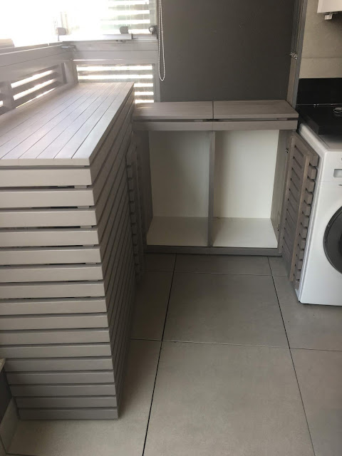 Além de esconder as condensadoras, ao lado do móvel das condensadoras foi feito um pequeno armário para roupas sujas e para servir de lixeira. Foi feito em madeira maciça Tauarí e pintada de cinza ânfora de prata, mesma cor das esquadrias.